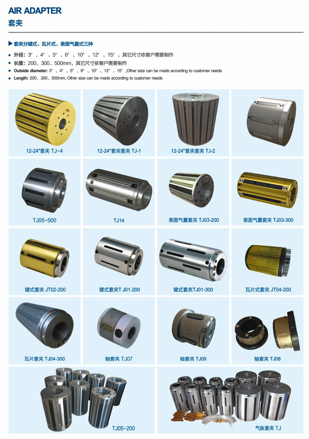 铝合金板条式气胀套夹,钢制瓦片式气胀套夹适用于涂布、分切、印刷、复卷、复合、造纸、塑料等相关机械的收放卷轴,适用于其它机械设备的有:涂布机、皮革机、定型机、压花机、分条机、模切机、复卷机、复卷机、纸筒机、贴合机、覆膜机、吹膜机、发泡机、淋膜机、压纹机、造纸机、无纺布机、验布机、烫金机、电池设备等相关机械配套之使用。
